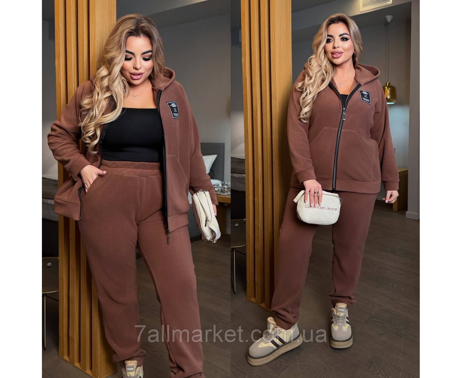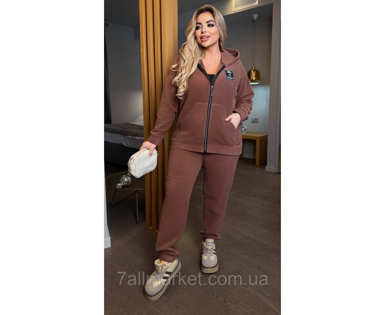 Костюм двійка Модель № 7894-1 ЯКІСТЬ ВІДМІННА Розмір : 46-48; 50-52; 54-56; 58-60 Тканина : дабл фліс полар ( гарно тягнеться ) Довжина кофта : 70 см.. Довжина рукава : 75 см. ( від горловини ) Довжина штанів : 110 см. Теплий костюм на холодну пору . Штани з високою посадкою , пояс на гумці . Кофта прямого покрою на блискавці , з капюшоном , кишені кенгуру