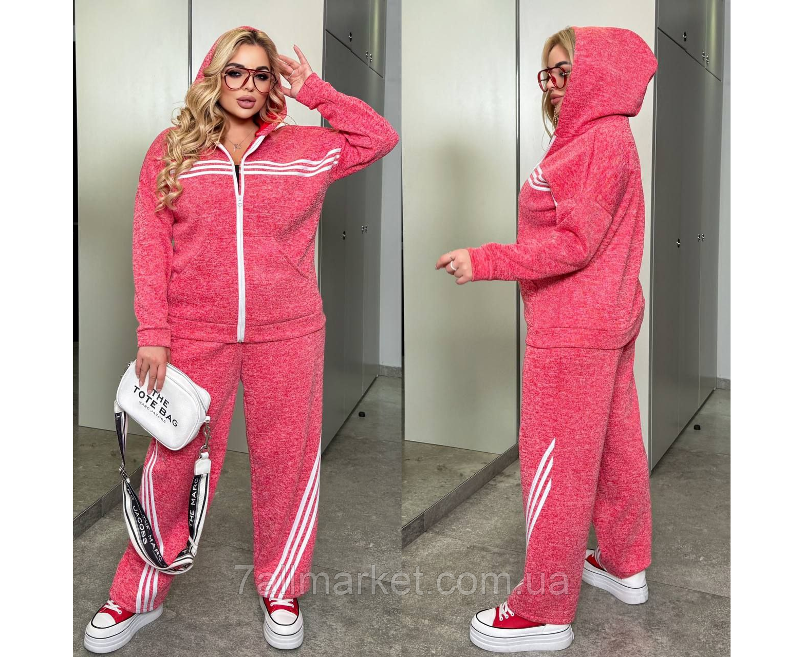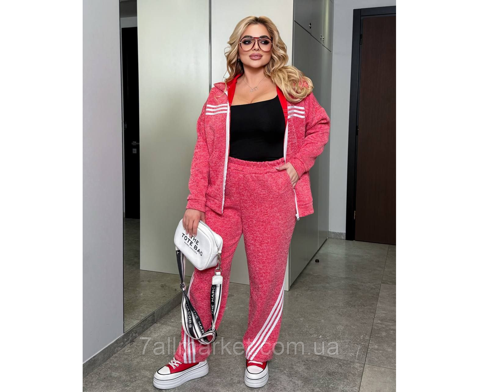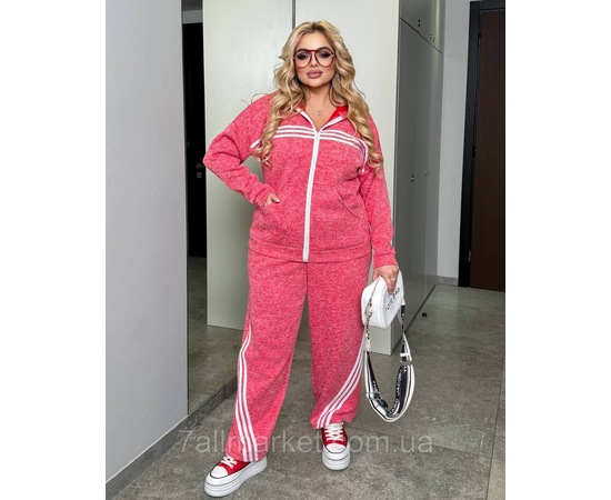 Костюм двійка Модель № 7995-1 ЯКІСТЬ ВІДМІННА Розмір : 46-48; 50-52; 54-56; 58-60 Тканина : подвійна - вʼязка на трикотажі ( гарно тягнеться ) Довжина кофта : 70 см.. Довжина рукава: 72 см. Довжина штанів : 107 см. Штани з високою посадкою , пояс на гумці , бічні кишені . Кофта прямого покрою на манжеті , на блискавці , з капюшоном , кишеня кенгуру