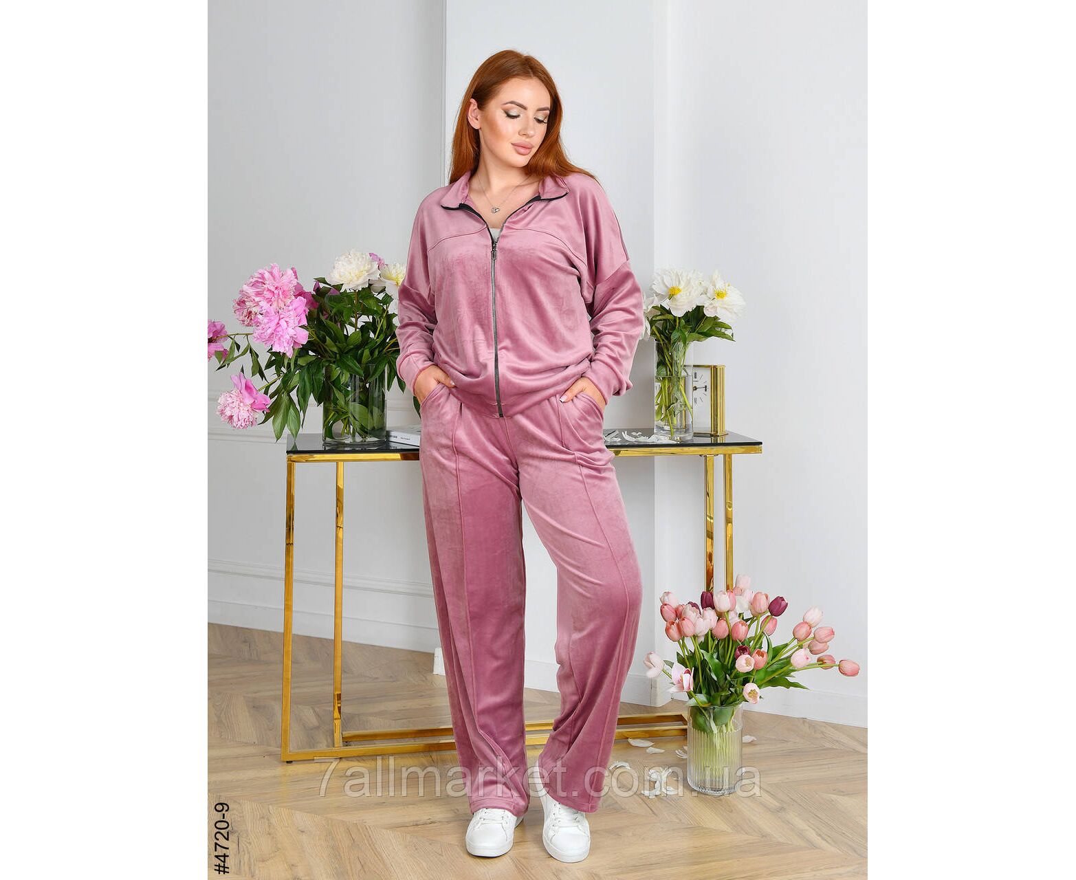 Жіночий велюровий костюм. Верх – кофта на блискавці. Низ – прямі штани зі стильною перестрочкою, у поясі широкий комфортний пояс. Відмінна якість тканини, пошиття. Гарне лекало, повномірна модель.
