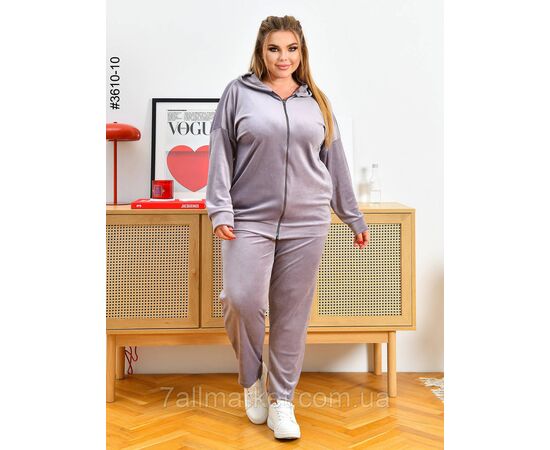 Жіночий спортивний костюм в батальних розмірах. Верх — кофта на блискавці та з капюшоном; оснащена манжетами на рукавах і поясі. Низ — прямі штани з широкою комфортною резинкою на поясі.