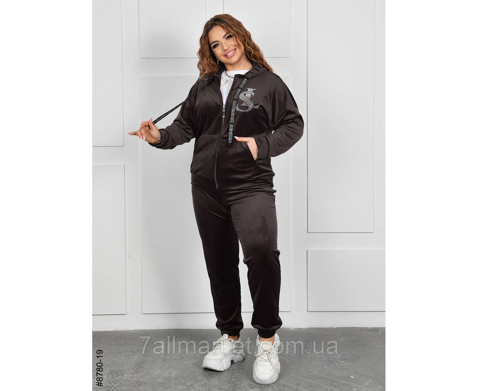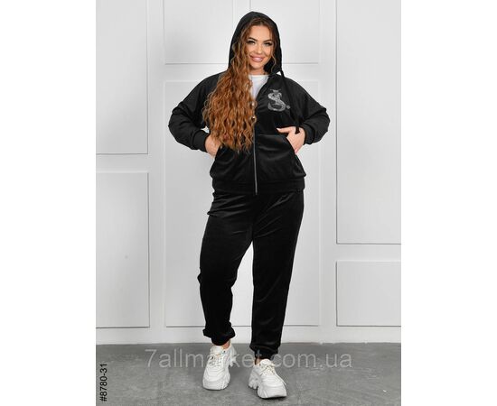Жіночий велюровий спортивний костюм у батальних розмірах. Верх — кофта на блискавці з капюшоном, доповнена стильним малюнком зі страз; низ — штани на манжеті-резинці.