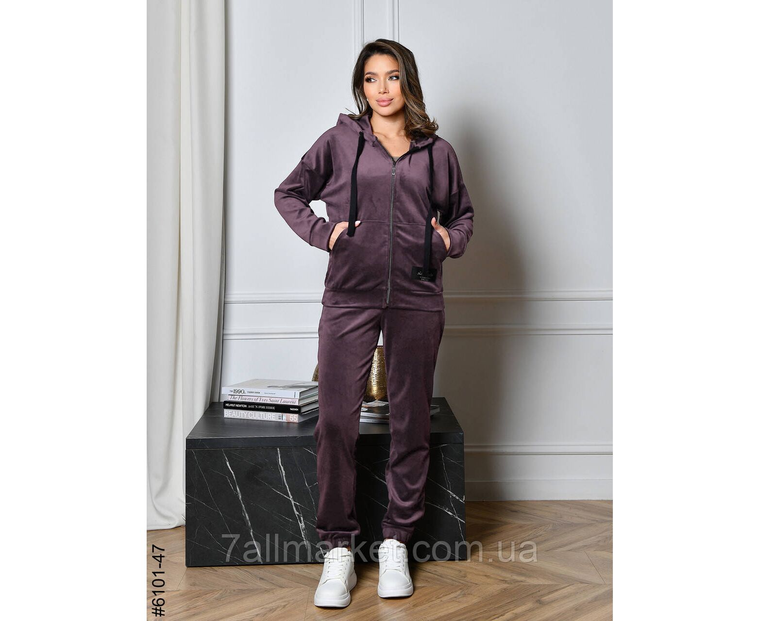 Жіночий велюровий спортивний костюм. Верх — худі з капюшоном на блискавці; обладнаний манжетом на рукавах. Низ — штани на широкій резинці, з бічними кишенями та манжетом-резинкою на штанинах.