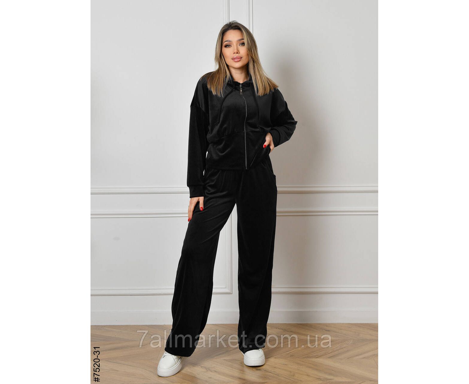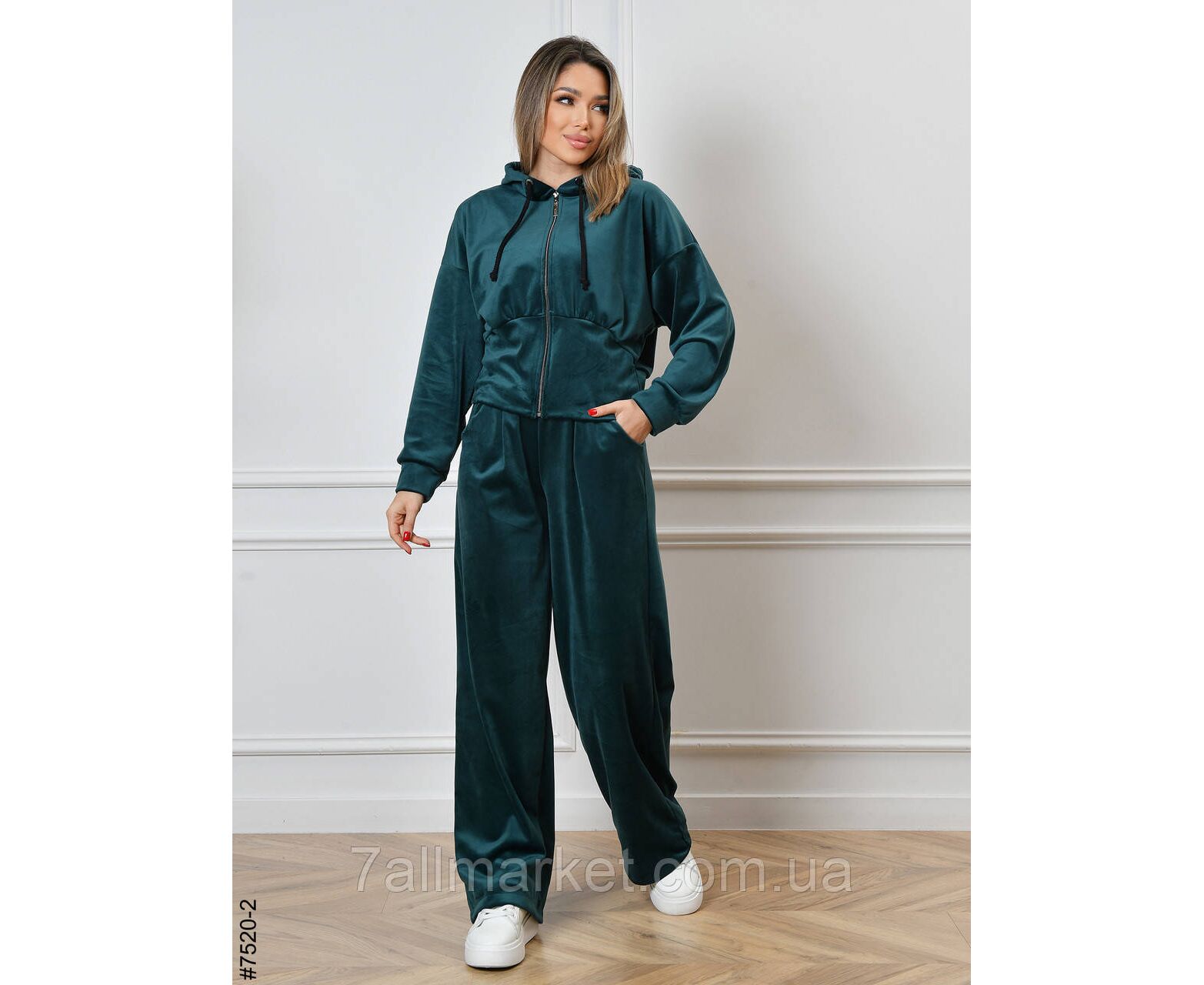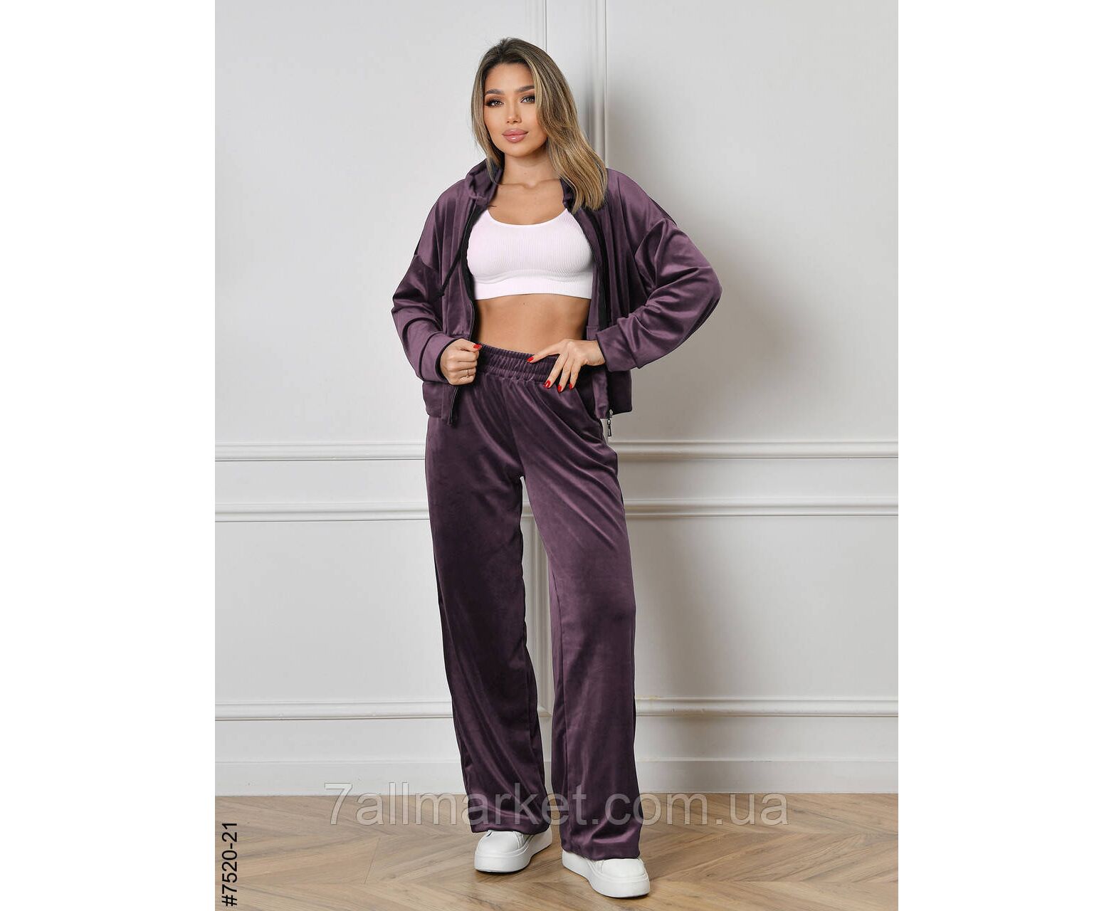 Жіночий велюровий спортивний костюм. Верх — укорочена кофта на блискавці; низ — прямі штани, у поясі широкій резинці.