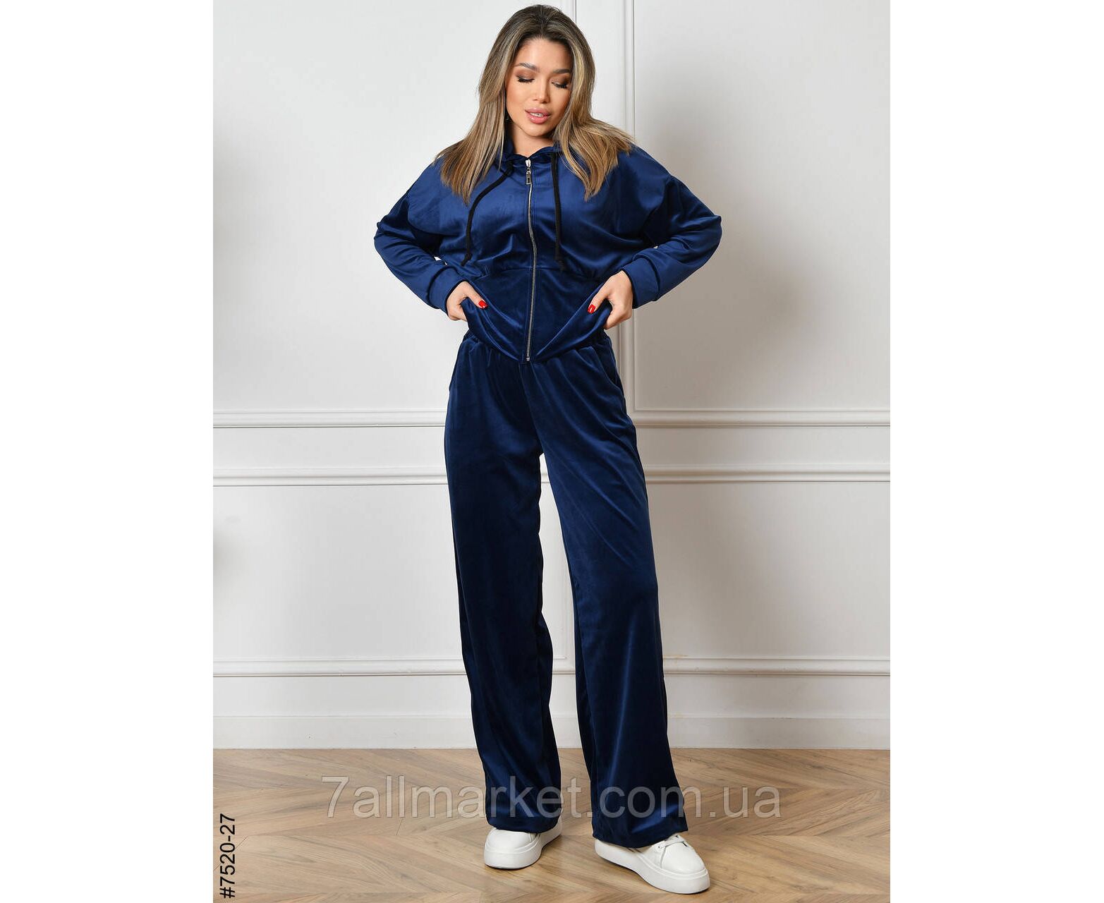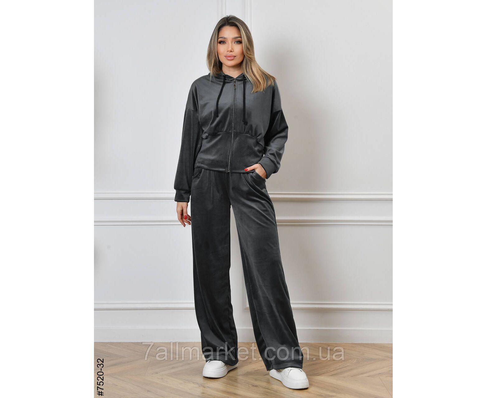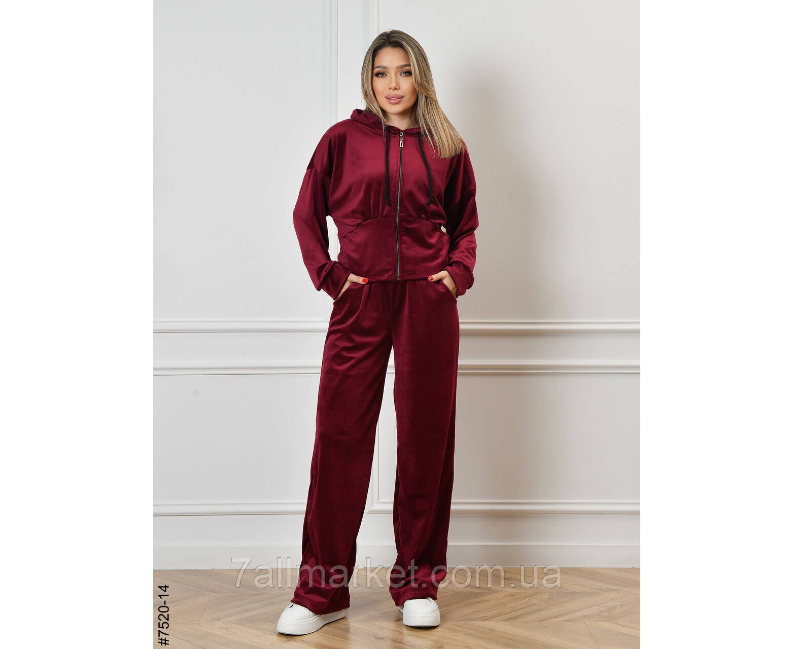 Жіночий велюровий спортивний костюм. Верх — укорочена кофта на блискавці; низ — прямі штани, у поясі широкій резинці.