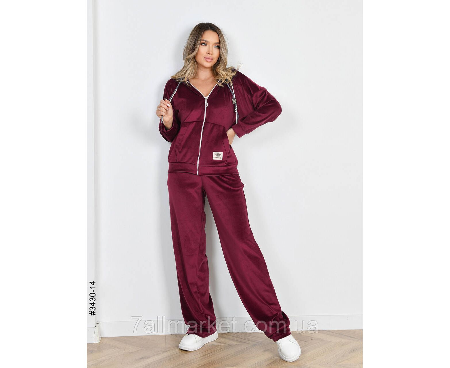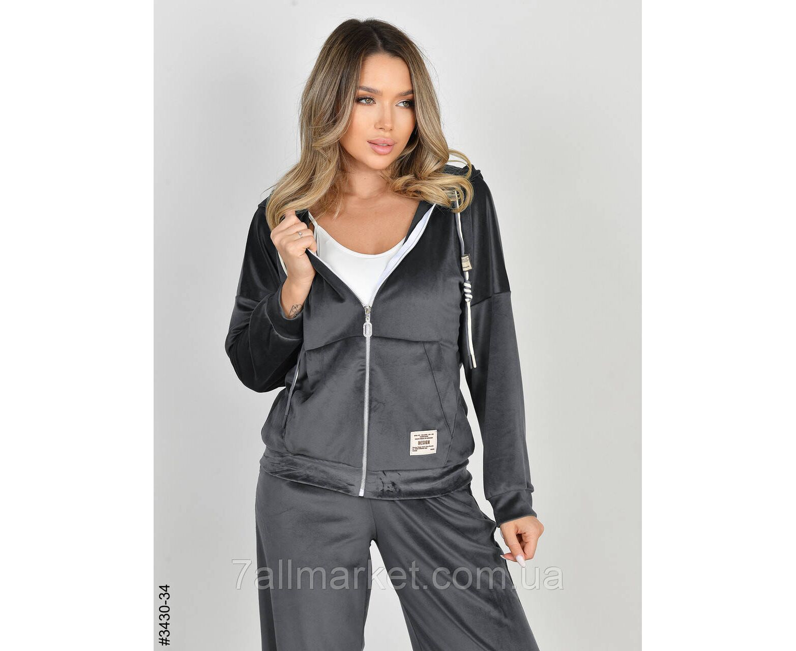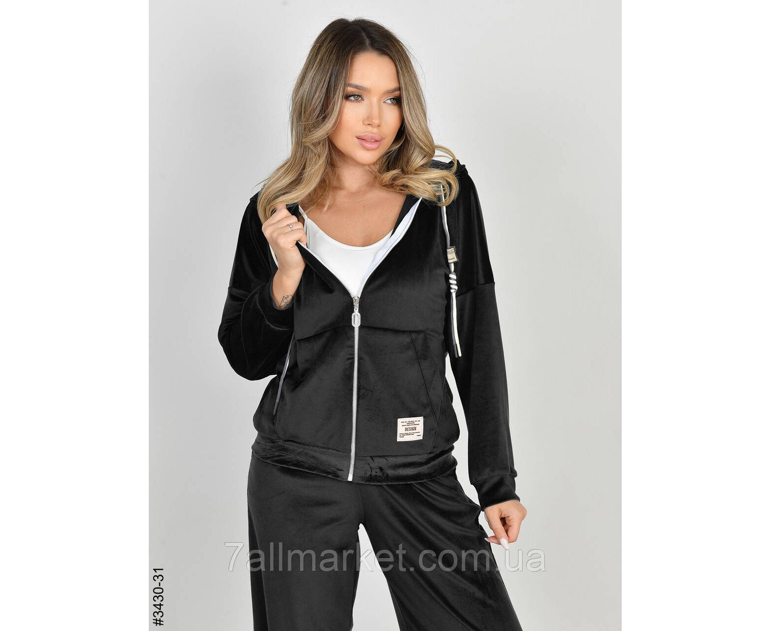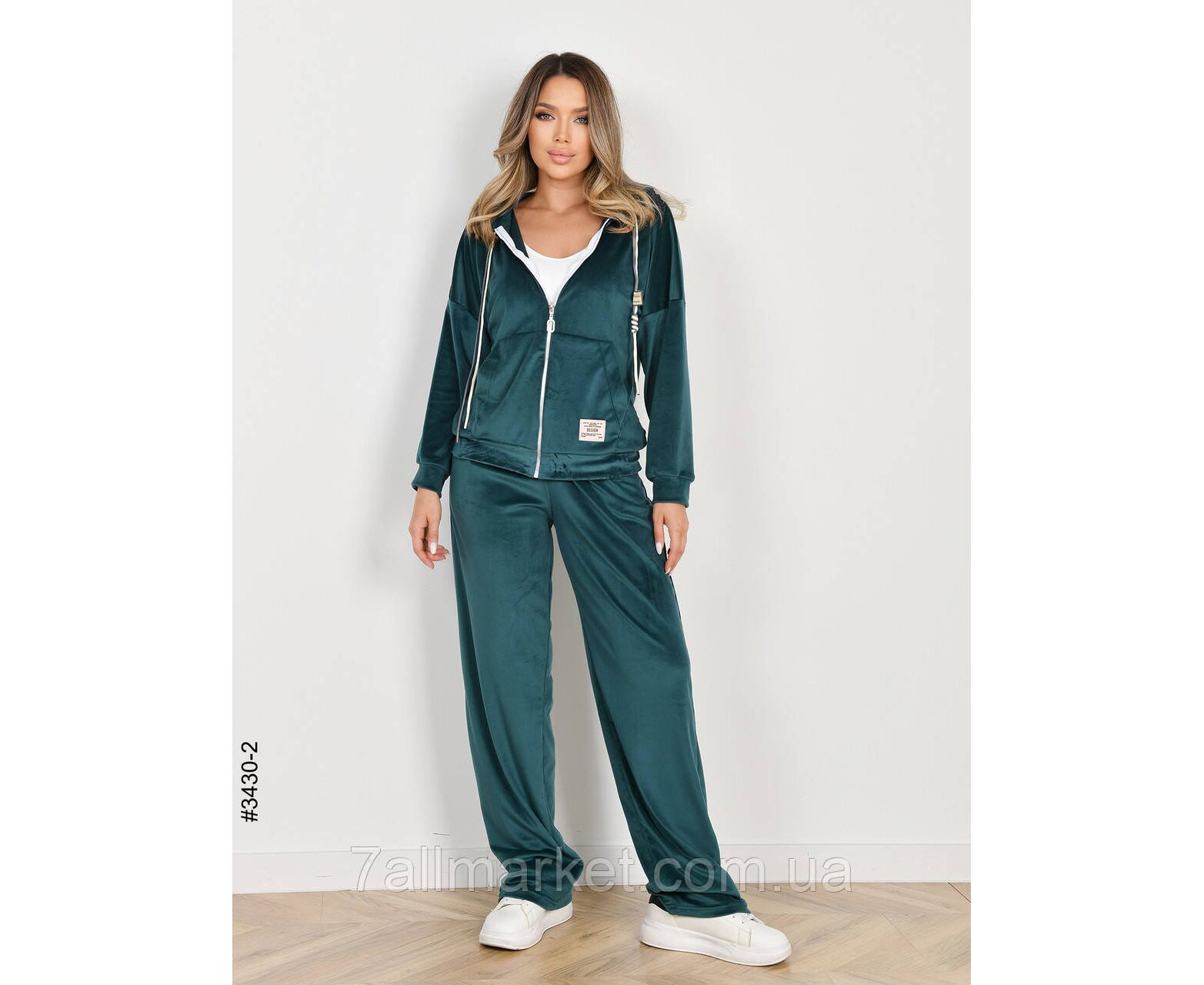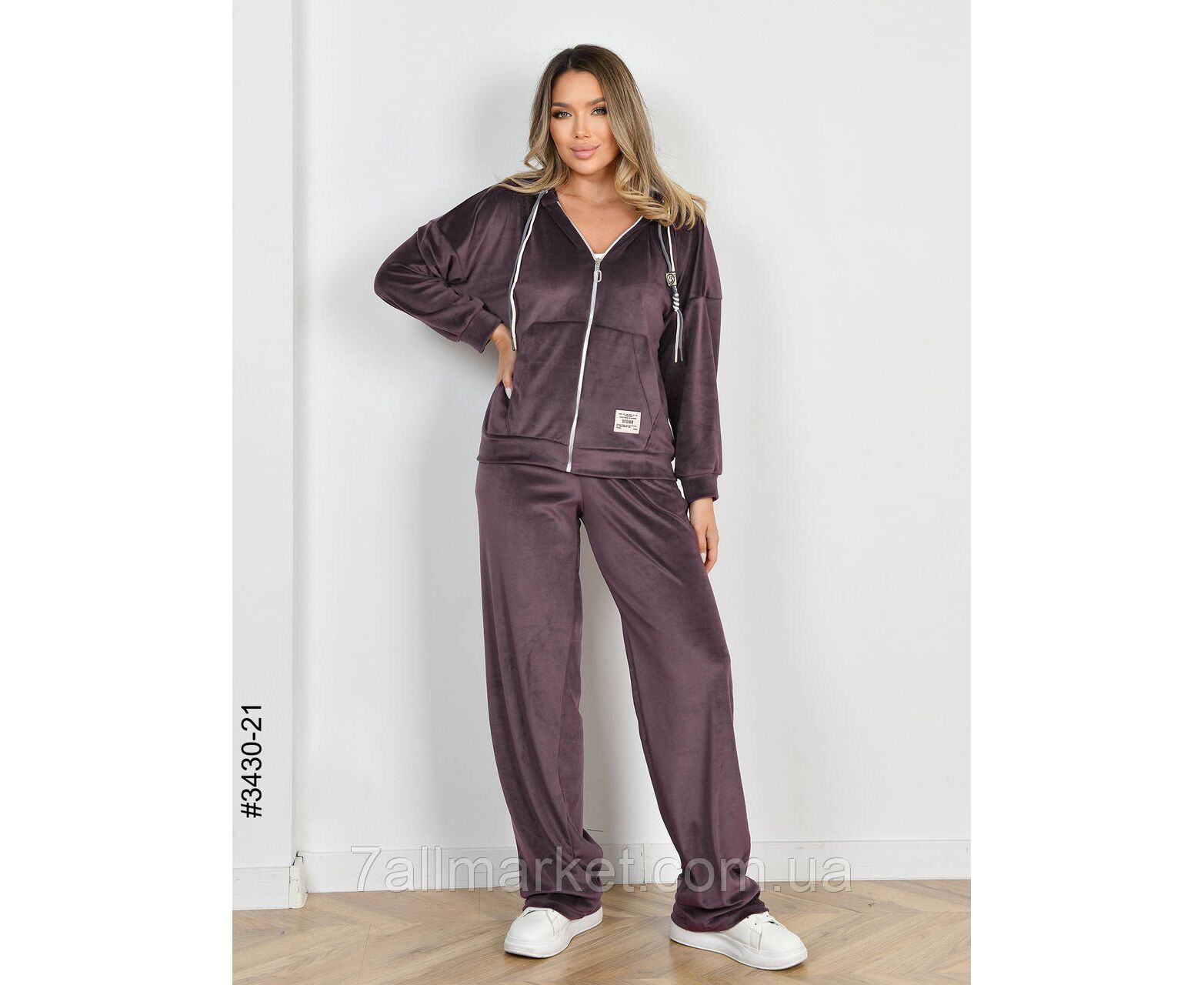 Жіночий велюровий костюм. Верх – кофта на блискавці. Низ – прямі штани з широким поясом на резинці. Відмінна якість тканини, пошиття. Гарне лекало, стильна повномірна модель.