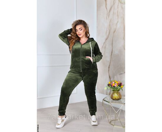 Жіночий велюровий спортивний костюм у батальних розмірах. Верх — худі з капюшоном на блискавці; обладнаний манжетами на рукавах. Низ — штани на широкій резинці, з бічними кишенями та манжетами на штанинах.