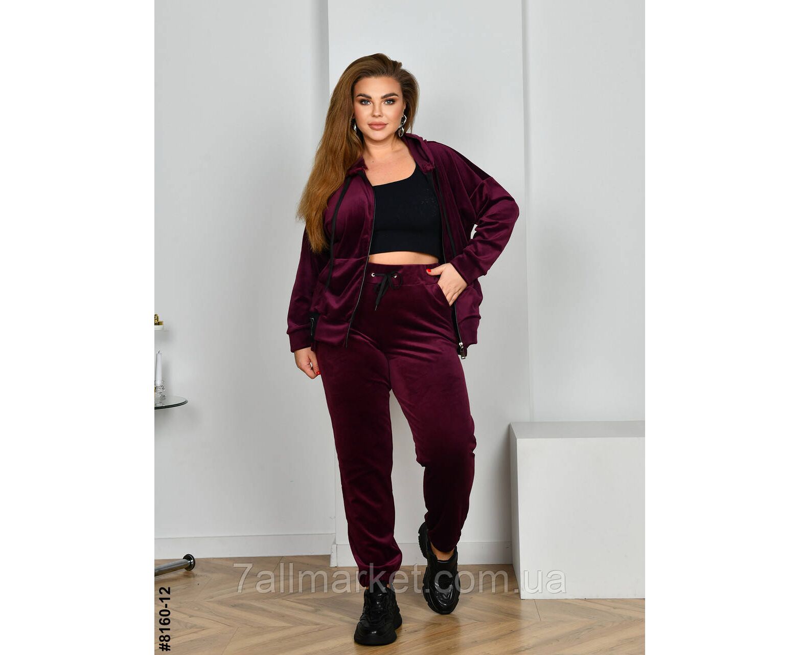 Жіночий велюровий спортивний костюм у батальних розмірах. Верх — худі з капюшоном на блискавці; обладнаний манжетами на рукавах. Низ — штани на широкій резинці, з бічними кишенями та резинками на штанинах.