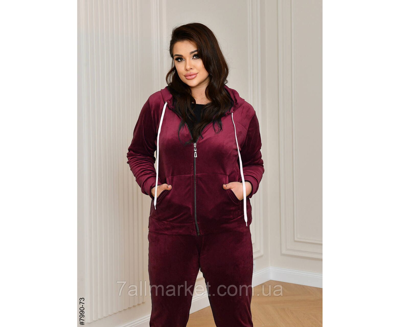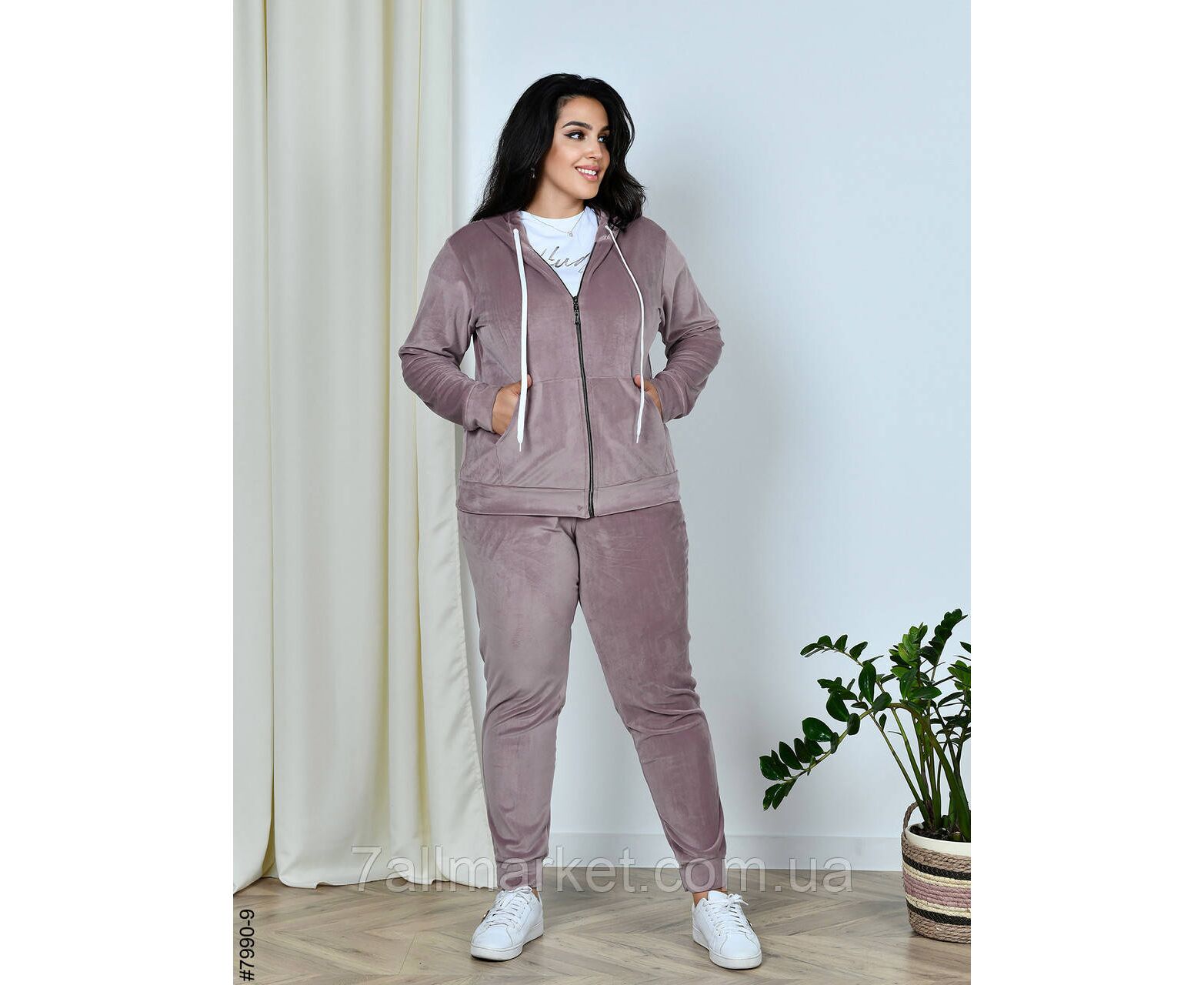 Жіночий велюровий спортивний костюм у батальних розмірах. Верх — худі з капюшоном на блискавці; обладнаний манжетами на рукавах. Низ — штани на широкій резинці, з бічними кишенями та манжетами на штанинах.