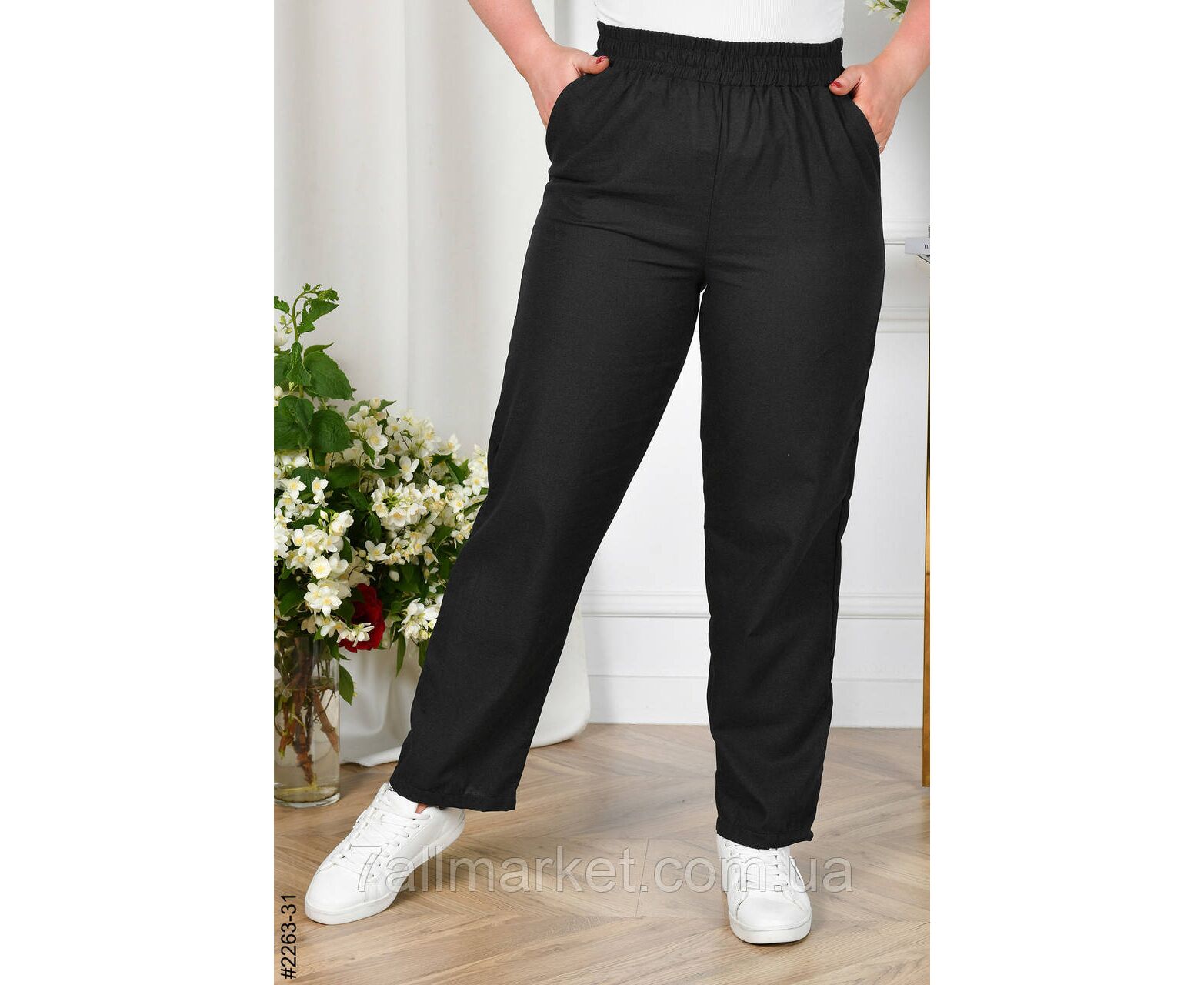 Жіночі лляні штани в батальних розмірах. Модель з прямою штаниною та широкою комфортною резинкою на поясі.